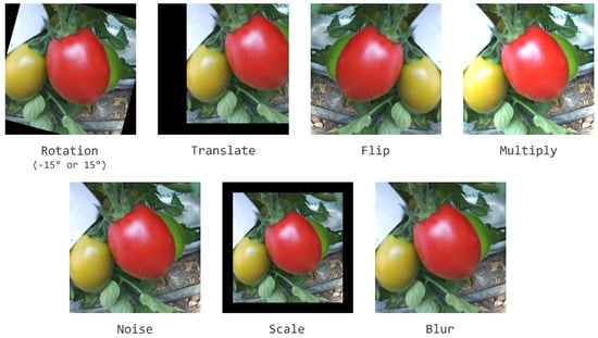 Data augmentation was used to artificially increase the dataset, improving the overall learning procedure and performance by inputting varied data into the model []. The transformations were carefully chosen, applying those that could happen in an actual robotic harvesting operation, just to the training and validation sets with a random factor, as displayed in Figure 3.