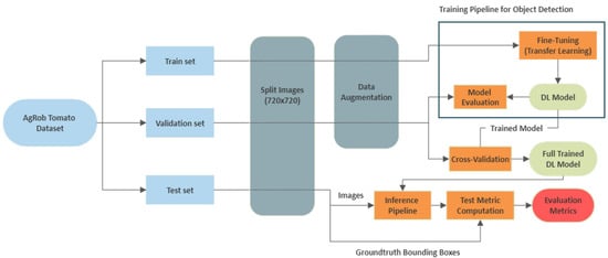 To train and evaluate the DL models, all images from the AgRobTomato Dataset and all images, except for the green tomato images, from the RpiTomato Dataset were selected. Since the AgRobTomato Dataset already had many green tomato images, it was decided not to select images of tomatoes at this stage of ripeness from the RpiTomato Dataset to balance the total set of selected images. A total of 632 images were selected.