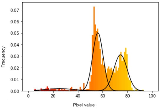 Gaussian mixture model was used to overcome this problem. This function is a probabilistic model for representing normally distributed subpopulations within an overall population (Figure 5) and was applied using the “sklearn.mixture.GaussianMixture” (see https://scikit-learn.org/stable/modules/mixture.html, accessed on 29 July 2021) function, from Sklearn (or scikit-learn) [].