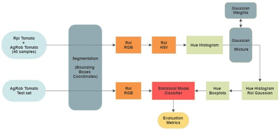 An approach based on histograms from the HSV colour space was developed as an alternative to DL models for tomato classification. All the scripts used throughout this process are authorship and were created from scratch through Spyder (see https://www.spyder-ide.org/, accessed on 25 October 2021). The developed HSV colour space model and the scripts can be found in the following GitHub repository: https://github.com/gerfsm/HSV_Colour_Space_Model (accessed on 25 October 2021).