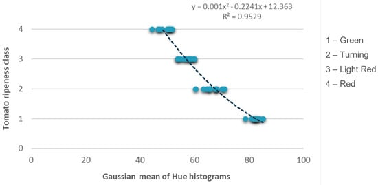 However, robotising tomato harvesting is not an easy task. The robot must detect and manipulate, in a heterogeneous and unpredictable environment, a fruit that also varies in position, size, shape, colour and even reflectance [,].The colour is used as an indicator of ripeness, and the desired level of ripeness by the producer can vary. As a climacteric fruit, tomatoes can be harvested at the physiological maturity stage (green colour), ripening detached from the plant, or at a more advanced stage, showing a reddish colour []. Therefore, in addition to detection, it is desirable to enable its classification based on colour, or even extract other relevant features, the so-called phenotyping process [], in order to achieve a selective and differentiated harvest.