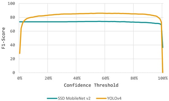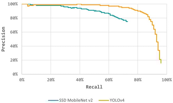 Through transfer learning, a fine-tune was performed on pre-trained models to detect and classify tomatoes. Slight changes to the default training pipeline were made, such as adjusting the batch size for each model (24 to the SSD MobileNet v2 model and 64 to the YOLOv4 model) and removing data augmentation from the pipeline. The SSD MobileNetv2 model training sessions ran for 35,000 epochs, while the YOLOv4 model training was much faster, requiring only 8000 epochs. The number of epochs may vary from model to model, but in this case, was chosen based on the suggestion given by the literature, but mainly taking into account the “average loss” training metric, selecting the number of epochs that would be sufficient to converge. As far as the MobileNet v2 SSD model is concerned, an evaluation session occurred at every 50 epochs, following the standard value used by the pre-trained models. Since Darknet had no available validation sessions, it was not considered for the YOLOv4 model. These evaluation sessions are quite useful, since they allow monitoring the evolution of the training, meaning if the evaluation loss started to increase while the training loss decreased or remained constant, the deep learning model was over-fit to the training data.