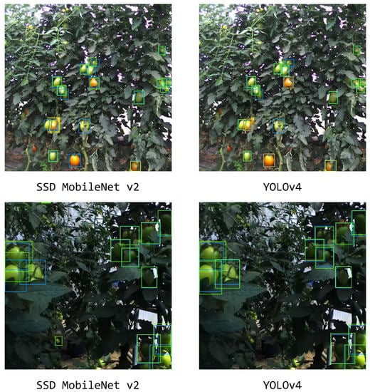 It is worth noting that some papers report the modification and improvement of several YOLO models. Chen et al. [] and Zhang et al. [] improved the YOLOv3 model, while Xu et al. [] improved the YOLOv3 Tiny model. Liu et al. [] developed the YOLO-Tomato, based on the YOLOv3 model, to detect tomato under complex environmental conditions and Lawal [] proposed fusing those same models with different activation functions to detect unripe and ripe tomatoes. The great results obtained by these authors show that improving and specifying the state-of-the-art DL models for a particular task can be a great advantage and lead to substantially better results.