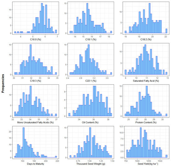 A significant difference was detected between the DH lines for the average of the traits in the two studied growing seasons (Table 1). The adjusted average of palmitic acid (C16:0), oleic acid (C18:1), linoleic acid (C18:2), linolenic acid (C18:3), erucic acid (C22:1), SFA, MUFA, OC, PC, DM, TSW, and SY showed that there was a pronounced diversity for future breeding programs (Figure 1). There were some contrasting genotypes for oil compositions, protein and oil content, seed yield and weight, and early/delay maturity habit, which are useful in omics studies to unravel the genetic mechanisms of these traits. This remarkable diversity among the DH lines perhaps are due to the different parental origin of these lines (Figure S1 and Table S1).