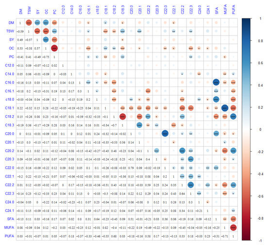 Heatmap correlations of the different characters of 136 camelina DH lines. Ns: p > 0.05; *: p ≤ 0.05; **: p ≤ 0.01; ***: p ≤ 0.001. The different colors (Red = negative correlations, Blue = positive correlations) in the scale, as well as the numbers on the right end side of the figure show the Pearson correlation coefficient.