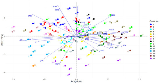 Biplot of genotypes according to PC1 and PC2 of measured traits. The DH lines (showed with the numbers in biplot) derived from each of the 15 different crosses are presented with a differentiated color.