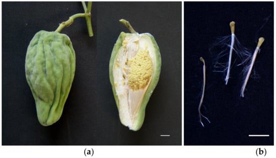 The seeds of Araujia sericifera were separated from fruits that were collected from an organic tangerine orchard that is situated at the coordinates 39.6235090, −0.2905290 (9°37′24.6″N 0°17′25.9″W), in Puçol, Valencia province, Spain. The soil has a loam texture with 30.60% sand, 47.55% silt, and 21.85% clay, and the pH is basic [29]. Figure 1 depicts the mature fruits (a) and seeds (b) of one of the moth plants that was sampled.