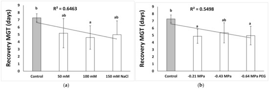 In both recovery treatments, either after exposure to NaCl or PEG, the germination speed increased, as revealed by a mean germination time lower than in previous control treatments (Figure 5a,b).