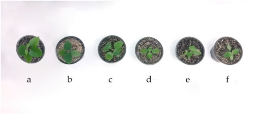 The visual effects of water deficit and salt stress on Araujia sericifera plants after one-month of treatments: (a), control; (b), water stress; (c), 150 mM NaCl; (d), 300 mM NaCl; (e), 450 mM NaCl; (f), 600 mM NaCl.