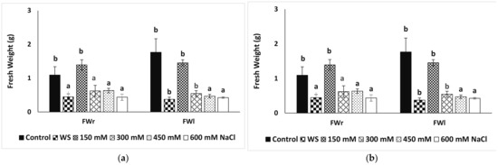 The average fresh weight (FW) of the roots and leaves of the plants that were watered with 150 mM NaCl did not differ significantly from those of the control, non-stressed plants (Figure 8a). On the contrary, a substantial reduction was registered for plants that were subjected to water stress (60 and 80% reduction for the root and leaf FW, respectively) or higher salt concentrations (Figure 8a). Growth inhibition under salinity conditions was concentration-dependent, with the strongest reduction observed in the presence of 600 mM NaCl (60 and 75% FW reduction for the roots and leaves, respectively) (Figure 8a).