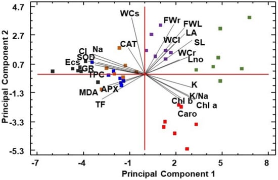 Principal component analysis: loading and scatter plots of the PCA scores were conducted with all the analysed traits in plants of Araujia sericifera after one month-treatments. The treatments: control—green, water stress—red, 150 mM NaCl—violet, 300 mM NaCl—brown, 450 mM NaCl—blue and 600 mM NaCl—black. Abbreviations: SL, stem length increase; Lno, leaf number increase; LA, leaf area; FWr, fresh weight of roots, FWl, fresh weight of leaves, WCr, water content of roots, WCl, water content of leaves; Chl a, chlorophyll a; Chl b, chlorophyll b; Caro, carotenoids; MDA, malondialdehyde; TFC, total phenolic compounds; TF, total flavonoids; SOD, superoxide dismutase; CAT, catalase; APX, ascorbate peroxidase; GR, glutathione reductase.
