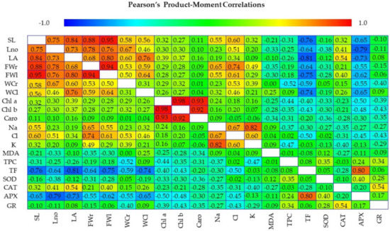 Pearson’s correlations between all the plant variables that were analysed in the control and water-stressed plants. Abbreviations: SL, stem length increase; Lno, leaf number increase; LA, leaf area; FWr, fresh weight of roots, FWl, fresh weight of leaves, WCr, water content of roots, WCl, water content of leaves; Chl a, chlorophyll a; Chl b, chlorophyll b; Caro, carotenoids; malondialdehyde (MDA); total phenolic compounds (TFC); total flavonoids (TF); superoxide dismutase (SOD); catalase (CAT); ascorbate peroxidase (APX); glutathione reductase (GR).