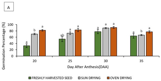 At 20 DAA, seeds were immature and had only 33% germination; however, drying using an oven improved germination to 82%. Several researchers have reported that drying, particularly slow drying, can enhance the ability to tolerate desiccation and improve germination [17,31]. The improvement in germination is due to the improvement of the cell membrane integrity.