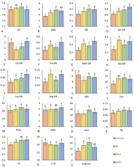 Results of the pot experiment with four tested variants, i.e., soil (control), soil amended with manure (M), soil amended with manure and Humac (M + H), and soil amended with manure and biochar (M + B). The measured parameters were as follows: (A) soil reaction = pH [-], (B) dehydrogenase activity [µg TPF·g−1·h−1], (C) basal respiration [μg CO2·g−1·h−1], (D) d-glucose SIR [μg CO2·g−1·h−1], (E) citric acid SIR [μg CO2·g−1·h−1], (F) d-trehalose SIR, (G) N-acetyl- β -d-glucosamine SIR [μg CO2·g−1·h−1], (H) l-alanine SIR [μg CO2·g−1·h−1], (I) L-lysine SIR [μg CO2·g−1·h−1], (J) l-arginine SIR [μg CO2·g−1·h−1], (K) arylsulfatase [nmol·g−1·min−1], (L) urease [nmol·g−1·min−1], (M) phosphatase [nmol·g−1·min−1], (N) N-acetyl- β -d-glucosaminidase [nmol·g−1·min−1], (O) β-glucosidase [nmol·g−1·min−1], (P) total soil nitrogen [%], (Q) total soil carbon [%], (R) C:N ratio [-], (S) dry plant aboveground biomass [g]. Different letters indicate differences between the values at the statistical level of significance p ≤ 0.05.