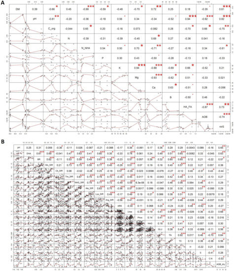 The Pearson’s correlation matrix of the maturated manure properties (A), soil, and plant properties (B). Explanation: . Significant at 0.10 level; * Significant at 0.05 level; ** Significant at 0.01 level; *** Significant at 0.001 level.