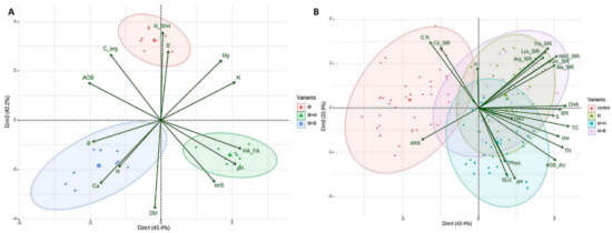 The PCA biplot of the maturated manure properties (A), soil and plant properties (B). (A) M = fermented manure, M + H = manure + Humac, M + B = manure + biochar; (B) control = control soil, M = soil amended with fermented manure; M + H = soil amended with manure + Humac, M + B = soil amended with manure + biochar.