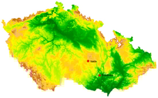 The experiment was carried out in the spring and summer of 2021 at two different localities (Figure 1). Troubsko locality (southern Moravia, Czech Republic) is represented by a dry and warm habitat. The area is characterized by its flat surface, with an average altitude of 285 m, average precipitation of 506.5 mm, and average yearly temperature over 9.5 °C. Vatín locality (western Moravia, Czech Republic) is represented by humid and cold conditions. The area is characterized by its hilly surface, with an average altitude of 560 m, average precipitation of 617 mm, and average yearly temperature over 6.9 °C (Table 1).