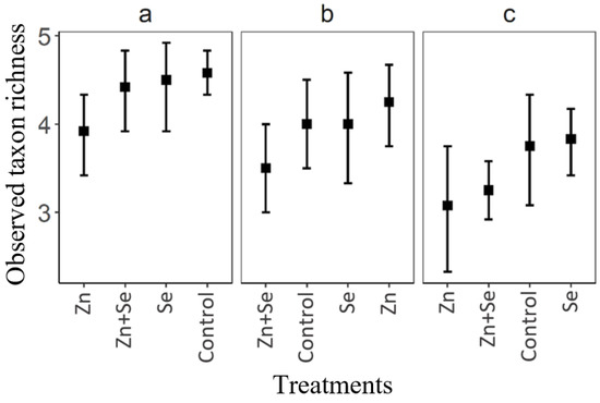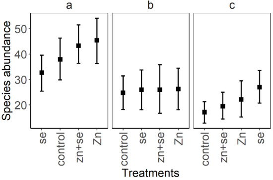 Differences in observed taxon richness according to the type of meadow mixture and treatment. Error bars represent 95% confidence intervals. The letters (a–c) represent the type of forage mixture.