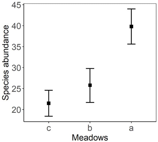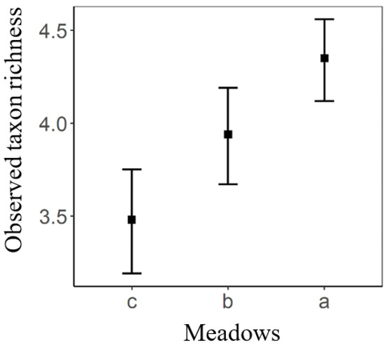 Differences in observed taxon richness according to the type of meadow mixture. Error bars represent 95% confidence intervals. The letters (a, b, c) represent the type of forage mixture.
