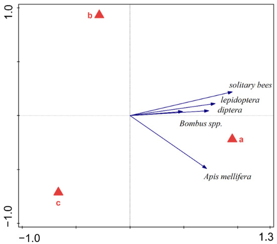 When comparing the meadow mixtures (Figure 3 and Figure 5), high differences in the results are seen. Mixture a was visited by pollinators most frequently, as it contained the most flowering plants (40% Fabaceae and 60% other blossom plants). These plants produce more nectar and nutritionally valuable pollen compared to Poaceae [49]. Conversely, the lowest pollinator richness and abundance was observed with mixture c, which contained the highest proportion of Poaceae and represented the least suitable feeding conditions.