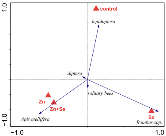 In addition to plants, selenium and zinc are essential for animals [41], which assumes a positive response for pollinators due to the improved qualitative and quantitative parameters of pollinators’ food resources due to increased zinc and selenium content in plants. In honey bees (Apis mellifera), an increase in antioxidant activity and an increase in the viability of both adults and larvae was observed during Zinc supplementation [42]. In an organism, selenium has catalytic, structural, and regulatory functions. It starts the action of many hormones, vitamins, and enzymes, thus ensuring the implementation of many biochemical and physiological reactions in the body, and helps to maintain the normal function of biological systems [43]. Thus, increasing the nutrition value in the diet may be a key factor in improving pollinators’ viability and detoxification ability [44].