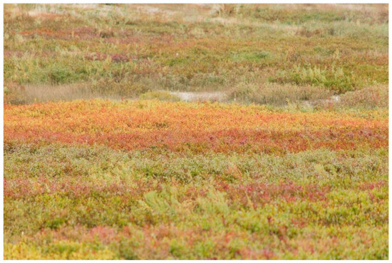 The wild blueberry production system is a unique semi-natural agricultural system with high genetic and physiological diversity in the field (Figure 1). Wild, or lowbush blueberries, are deciduous woody perennials native to North America. They naturally grow on acidic soils (pH 4–5) and can tolerate a soil pH level as low as 2.5 [22]. They can be found on any soil type in the understorey of forests but grow optimally in well-drained soils [23,24]. Naturally growing wild blueberry plants, mainly Vaccinium angustifolium Aiton and Vaccinium myrtilloides Michx. [25,26] are commercially managed to form a carpet of plants (Figure 1) for berry production in Maine USA and the Maritime provinces and Quebec in Canada [27]. A two-year crop scheme has been adopted for the management of commercial wild blueberries in the field, where berries are produced and harvested in fields every second year [28]. The aboveground vegetation is pruned by burning or mowing after harvest to create a prune year (year one) and then a crop year (year two).