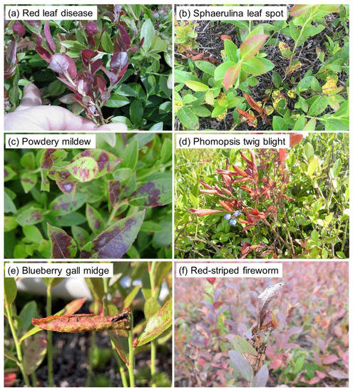 Symptoms of major diseases and insect pests in the wild lowbush blueberry field investigated in the present study. The photos show the typical symptoms of (a) red leaf disease, (b) Sphaerulina leaf spot disease, (c) powdery mildew, (d) Phomopsis twig blight, (e) blueberry gall midge, and (f) red-striped fireworm. Photos were taken in the field by Seanna Annis (a–d) and Lily Calderwood (e,f).