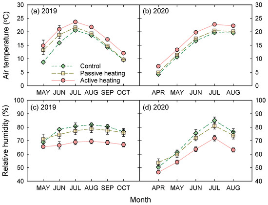 Mean monthly atmospheric temperatures in 2019 (a) and 2020 (b), as well as mean relative humidity in 2019 (c) and 2020 (d) of different treatments. Green diamonds denote the ambient control plots (CON), yellow squares are passive-heating (PH) open-top-chambers (OTCs), while red circulars indicate the and active-heating (AH) OTCs. The values are means ± SEs (four weather stations in the AH and PH chambers and two weather stations in the CON).