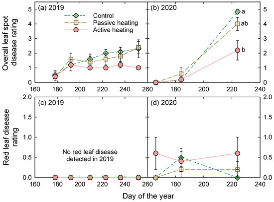 Incidence of overall leaf spot disease (a,b) and red leaf disease (c,d) of wild blueberries under different treatments in 2019 (prune year; a,c) and 2020 (crop year; b,d). The rating ranked from 0–5 (0 = not present, 1 = ≤20%, 2 = 20–40%, 3 = 40–60%, 4 = 60–80%, 5 = 80–100%) of the control plots (CON), passive-heating OTCs (PH) and active-heating OTCs (AH). Data are means ± SEs. Green diamonds with dashed lines denote the ambient control plots (CON), yellow squares with dashed lines are passive heating (PH) OTCs, while the red circulars with solid lines indicate the active heating (AH) OTCs. The absence of letters or points with the same letter indicate treatments that do not differ significantly (p > 0.05).