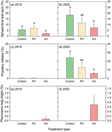 At the end of the growing season of 2019, the percent infection of wild blueberries by Sphaerulina leaf spot disease under the AH treatment was significantly lower compared to the control and PH treatment, but no differences were detected between plants in the control and the PH treatment (Figure 5a). At the end of the growing season in 2020, the percent infection by Sphaerulina leaf spot disease of wild blueberries under the AH treatment was significantly lower compared to the control, but no differences were detected between the control and PH treatment (Figure 5b). No significant difference in powdery mildew was detected among different treatments in 2019 (Figure 5c). However, in 2020, the percent infection of powdery mildew was significantly lower on plants in the AH treatment compared to the control (Figure 5d). No leaf rust was detected under any of the treatments. Phomopsis twig blight was only detected in wild blueberry plants under the AH treatment in both 2019 and 2020 (Figure 5e,f) but at low percentages (0.08% in 2019 and 0.7% in 2020).