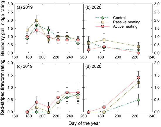 Warming effects on insect pests. The ratings of blueberry gall midge (a,b) and red-striped fireworm (c,d) of wild blueberries under different treatments in 2019 (prune year; a,c) and 2020 (crop year; b,d). The rating ranked from 0–5 (0 = not present, 1 = ≤20%, 2 = 20–40%, 3 = 40–60%, 4 = 60–80%, 5 = 80–100%) of the control plots (CON), passive-heating OTCs (PH) and active-heating OTCs (AH). Data are means ± SEs. Green diamonds with short dashed lines denote the ambient control plots (CON), yellow squares with long dashed lines are PH OTCs, while red circulars with solid lines indicate the AH OTCs. The absence of letters indicates treatments that do not differ significantly (p > 0.05).
