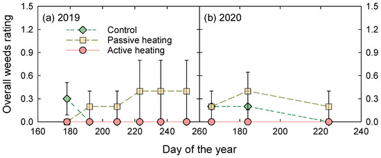 Warming impact on weeds. The incidence of overall weeds of the wild blueberry fields under different treatments in 2019 the prune year (a), and in 2020 the crop year (b). Data are means ± SEs. Green diamonds with short dashed lines denote the ambient control plots (CON), yellow squares with long dashed lines are passive-heating (PH) OTCs, while red circulars with solid lines indicate the active-heating (AH) OTCs. No significant differences were detected among the treatments (p > 0.05).