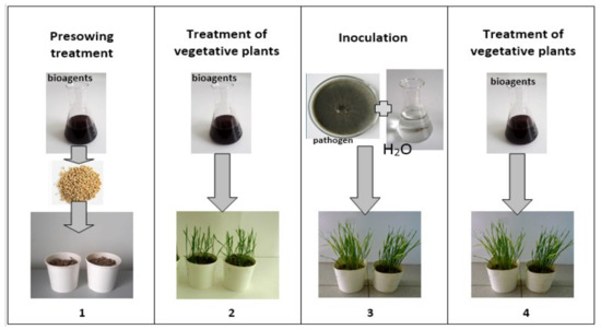 The experiment consisted of four stages: presowing treatment (or sowing grain without treatment), first treatment of vegetative plants, pathogen suspension inoculation, second treatment of vegetative plants (Figure 1).