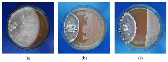 Antagonistic activity was examined with the dual cultures method on optimized culture media [27]. We placed mycelial agar blocks in Petri dishes (PD), while the bacterial strain was applied by the stroke method at a distance of 6 cm from the pathogen block. The cultures were then incubated for 20 days at 28.0 °C. Pure pathogen fungal cultures and bacteria seeded separately are used as controls.