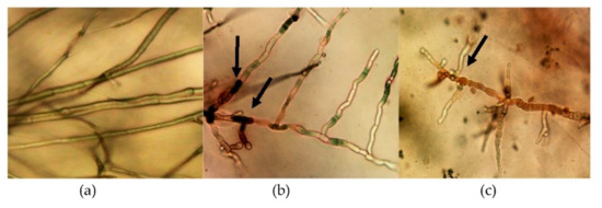 Hyphae of P. tritici-repentis Kr-15/2016: control (a); decomposition of mycelium during co-cultivation with strain BZR 336 g on day 10 (b), and with 517 strain on day 14 of co-cultivation (c). Arrows show the areas with the release of pigmented hyphae contents; magnification ×200.