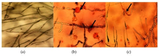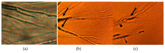 Hyphae of P. tritici-repentis Kr-15/2016: in control without an antagonist (a); after three days of co-cultivation with B. velezensis BZR 336 g (b) and BZR 517 (c), arrows show the pigmentation of hyphae; ×200 magnification.
