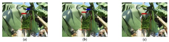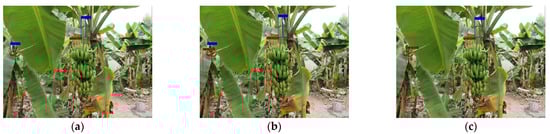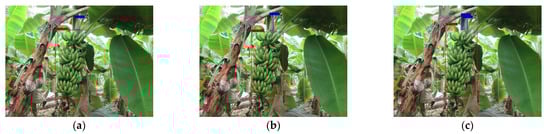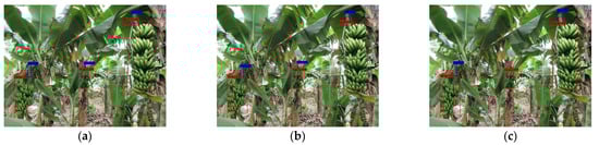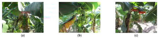 Examples of missed detection of the three models: (a) YOLOv4 missed the left stalk; (b) YOLO-Banana missed the right talk; (c) YOLO-Banana-l4 missed the left banana bunch and the right bunch with its stalk.