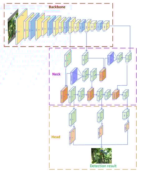 With the popularity of big data and the rapid development of GPUs, the application of deep learning algorithms in visual detection is advancing by leaps and bounds. Deep learning networks extract deeper features and have stronger learning ability. The deep neural network structure is more complex than traditional machine learning algorithms, the extracted features are more abstract, and the detection results have better generalization capabilities. Deep learning methods strike a balance between accuracy and real-time operation. Since LeCun proposed LeNet in 1998 [], deep learning neural networks have been gradually applied and promoted in object classification, image segmentation, and object detection. In 2012, the emergence of AlexNet [] pushed deep learning to the fore. In a complex agricultural environment, deep neural networks provide useful tools for the detection of fruits and vegetables. The classification network VGGNet was applied to the detection of red dates [] and kiwifruits [], which improved detection performance by increasing depth; Resnet has a deeper network but lower parameters than VGGNet. The improved Resnet was discussed for apples [], strawberries [], waxberries [], and banana stalks []. The segmentation network solves the problem of image segmentation at the pixel level, e.g., FCN and SegNet neural networks were compared in the detection of grapevine cordon shape [], and the Deeplabv3 series was used for multiple lychee fruit-bearing branches [] and banana stalk segmentation []. An improved FCN was presented to detect the fruit center of guavas []. Compared with classification networks and segmentation networks, there are more application examples of detection networks in fruit and vegetable detection. The RCNN series are classical two-stage detectors that are based on the candidate regions, which were exploited in the detection of tomatoes [], banana plants [], and flowers []. An improved sweet pepper detection network DCNN based on Faster RCNN was proposed []. MobileNet is a small and efficient CNN model that offers a compromise between accuracy and latency. The authors of [] used MobileNet to detect Hass avocado, lemon, and apples compared with Faster RCNN. EfficientDet trades off the speed and accuracy of the neural network; it was used by [] to reconstruct the 3D global mapping of the orchard. YOLO series, which will be introduced in the following section, were used for cucumber internode length [], kiwifruits [], grapefruits [], grapes [], banana bunches [], and banana bunches and stalks []. At the same time, improved networks based on YOLO series, namely MangoYOLO [], YOLO-Tomato [], and YOLOMuskmelon [], were proposed; beyond these, the improved YOLOv3 was applied to detect the banana inflorescence axis [] and an improved YOLOv5 method was described for apple detection [].