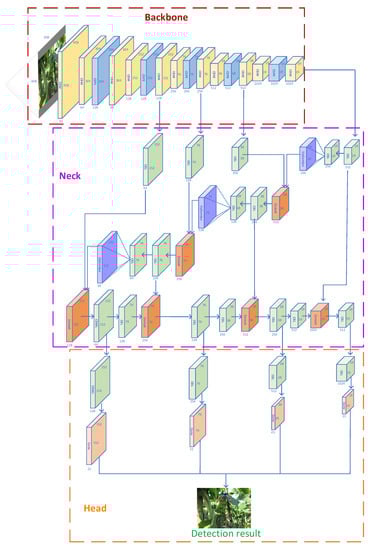 In the past few decades, the research of machine vision in fruit and vegetable detection has been rapidly updated with the development of artificial intelligence technology []. Before the explosion of deep learning, most fruit and vegetable detection methods were based on traditional machine learning algorithms, which are mostly based on hand-designed features (color [,], shape [,], texture [,], or fusion features [,], etc.) and appropriate classifiers (Adboost [], support vector machine [], etc.) to locate the object region in the image []. However, these methods often lack universality and robustness.