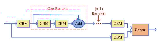 This study proposes two improved models, the YOLO-Banana model and YOLO-Banana-l4 model, as shown in Figure 2 and Figure 3. In the figures, the yellow module CBM (Convolutional + Batch Normalization + Mish) represents the convolution operation of Batch Normalization and the Mish activation function. The Mish activation function is used in the backbone part of the network to improve the accuracy of the network; in other parts of the network, the activation function still chooses the traditional Leaky ReLu function. The green module CBL (Convolutional + Batch Normalization + Leaky ReLu) represents the convolution operation of Batch Normalization and the Leaky ReLu activation function. The blue module represents the CSP structure, and CSPn contains n Res units, as shown in Figure 4. The orange module is the Concat operation, which corresponds to the route operation in the config file, which represents tensor splicing and expands the dimensions of the two tensors. The purple module represents the up-sampling operation, which implements FPN through up-sampling and then implements PAN through down-sampling through convolution operation to form a neck structure. The YOLO-Banana model keeps the backbone structure of YOLOv4, removes the SPP module, and simplifies the convolution numbers in the neck structure. In the YOLO-Banana model, the backbone is the CSPDarknet53 model, the neck structure is a FPN + PAN structure with 11 CBL modules, and the head part is the classic YOLO prediction part. In the head structure, the YOLO-Banana model has three scales. Each scale predicts three anchor boxes, with 7 values per anchor [4 box coordinates + 1 object confidence + 2 class confidences]. Therefore, the dimension of each scale is 21.