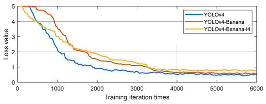 As the model structure had been changed, the official pre-weights of YOLOv4 were no longer applicable. Therefore, the YOLO-Banana model and YOLO-Banana-l4 model started training without pre-weighting, and after every 100 iterations, they were saved and updated to the latest weight file to use as pre-weights when training resumed after a training interruption. At the same time, the weight file of each 1000 iterations was saved as the training result, which was used to compare and analyze the training process of the YOLO-Banana model, YOLO-Banana-l4 model, and YOLOv4 model. The input resolution of the three models was 608 × 608, and the number of iterations was set to 6000. The training time is shown in Table 2. Compared with YOLOv4, YOLO-Banana’s pruning of the model shortens the training time, and the four-layer head structure in YOLO-Banana-l4 increases the training time under the same input and number of iterations.