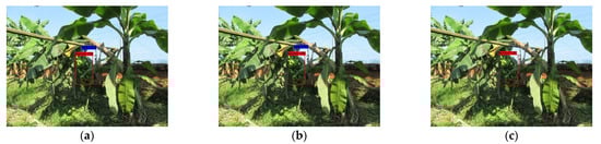 Comparison of the detection of the three models under sunny conditions: (a) YOLOv4 accurately detected the banana bunch and the stalk; (b) YOLO-Banana accurately detected the banana bunch and the stalk; (c) YOLO-Banana-l4 accurately detected the banana bunch, but the stalk was missed.