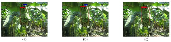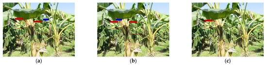 From the above results, the YOLO-Banana model reduces the detection time and model weight of YOLOv4 under the premise of ensuring accuracy. Compared with our previous works [] and [], this study extends the detection object to banana bunches and stalks and improves the performance of the detection model. We further compare the detection results of YOLOv4 and YOLO-Banana with other detection networks [] and [] for banana bunches and stalks, as shown in Table 7. The banana bunch detection rates of YOLOv4 and YOLO-Banana are higher than those in [] and []. The banana stalk detection rates of YOLOv4 and YOLO-Banana are lower than that in [], which is because we limit the banana stalk area to only contain the stalk, and [] defines a much larger area for the stalks, which reduces the detection difficulty. In terms of detection time, the detection time in [] is 240 ms, and [] does not specify the detection time. It can be seen from the comparison that the model proposed in this study achieves good results in terms of detection accuracy and detection time, as well as the setting of the detection area.