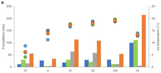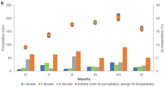 Decadal and monthly cumulated precipitation and average air temperature (°C) from April to September for the growing seasons 2017 (a) and 2018 (b) at the experimental site. Bars represent precipitation, and points represent air temperatures.