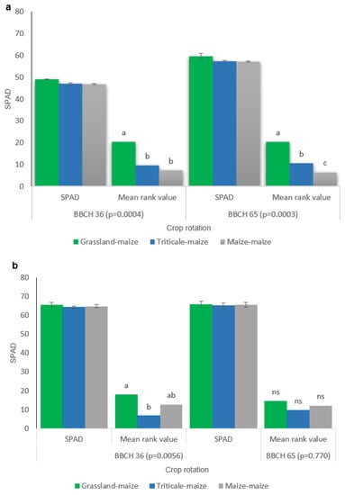 Relative chlorophyll content (SPAD) in the leaves in maize in 2017 (a) and 2018 (b). Mean rank value of the Kruskal-Wallis test. Different letters indicate significant differences among treatments.