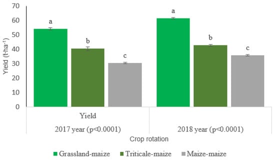 Yield (t·ha−1) of maize silage biomass (BBCH 85). Different letters indicate significant differences among treatments (with p < 0.05).