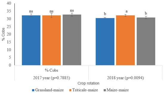 Proportion (%) of the cobs in the yield weight (BBCH 85). Different letters indicate significant differences among treatments (with p < 0.05). ns—not significant.