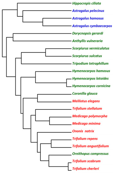 - Wojciechowski, M.F.; Lavin, M.; Sanderson, M.J. A phylogeny of legumes (Leguminosae) based on analysis of the plastid matK gene resolves many well-supported subclades within the family. Am. J. Bot. 2004, 91, 1846–1862. [Google Scholar] [CrossRef]