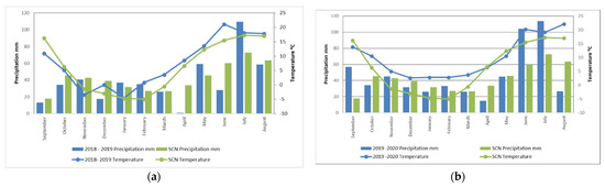 Meteorogical conditions during the vegetative period of winter wheat, 2018–2019 (a) and 2019–2020 (b) at Joniškelis Experimental Station of the Lithuanian Research Centre for Agriculture and Forestry (SCN–standard climate norm).