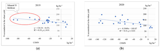 Dependence of nitrogen accumulation in winter wheat yield on changes to soil mineral nitrogen (CSMN) values during vegetation 2019 (a) and 2020 (b).